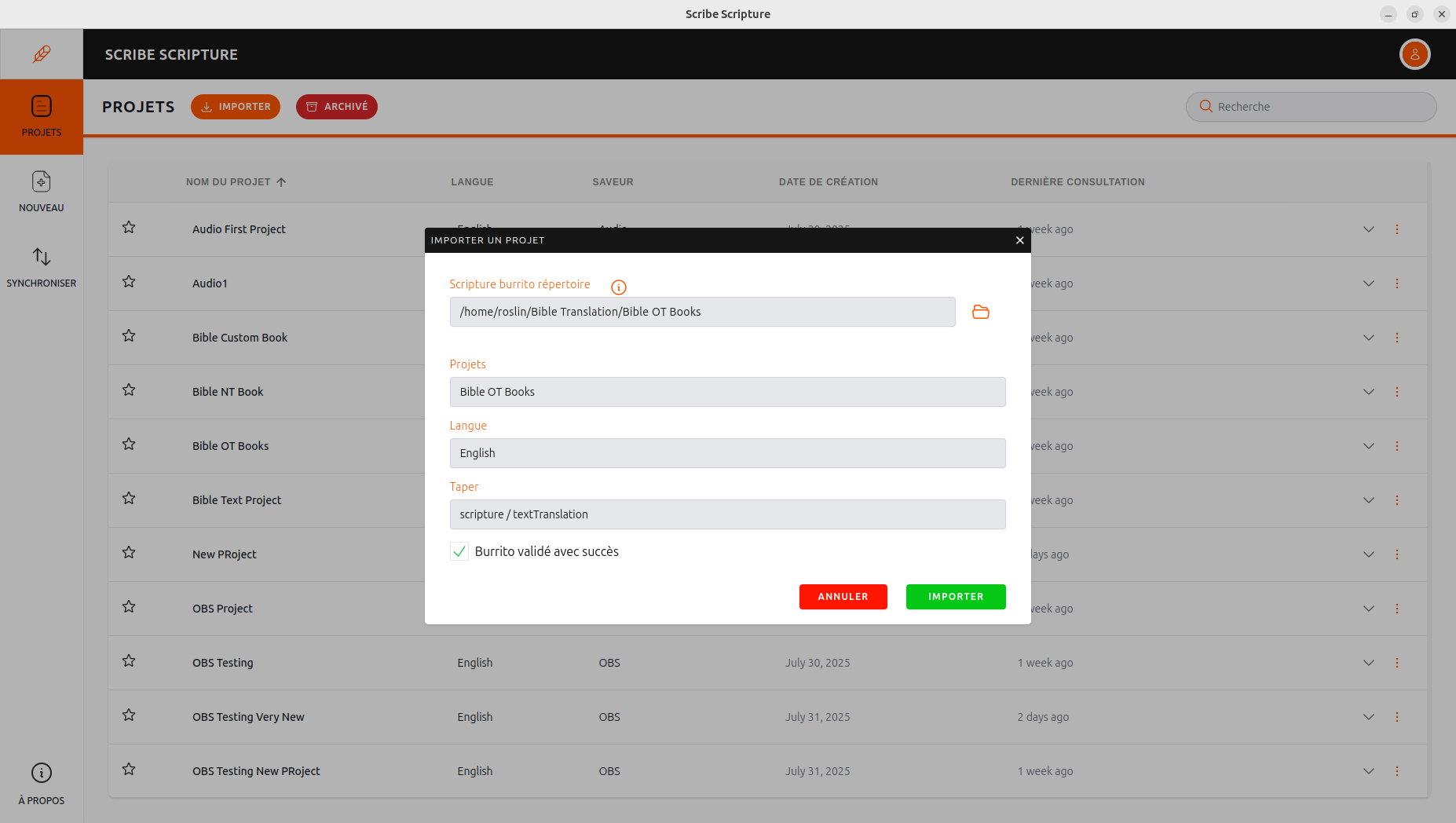 - La boîte de dialogue IMPORTER UN PROJET apparaîtra et affichera les détails du projet, tels que le répertoire Scripture -Burrito, le nom du projet et de la langue et le type de projet.