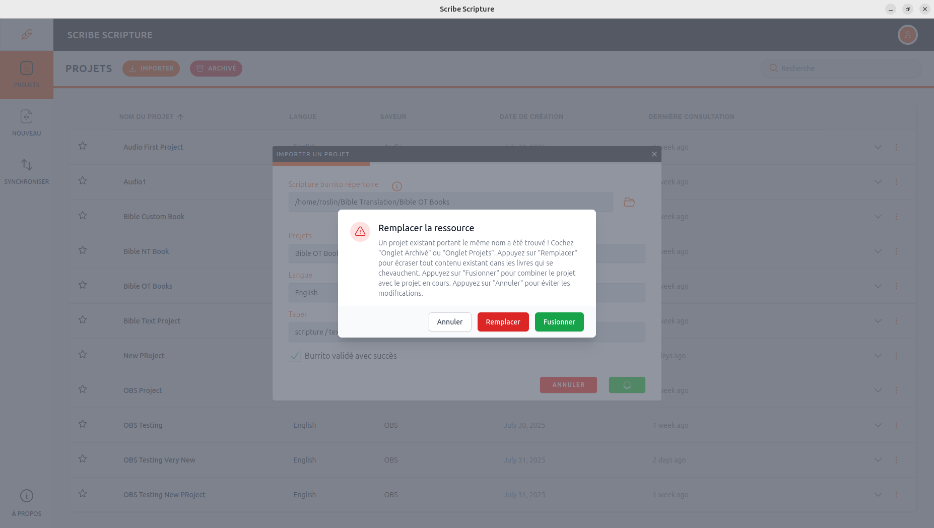 - Si Remplacer est choisi, l'ensemble du projet est remplacé par le contenu entrant