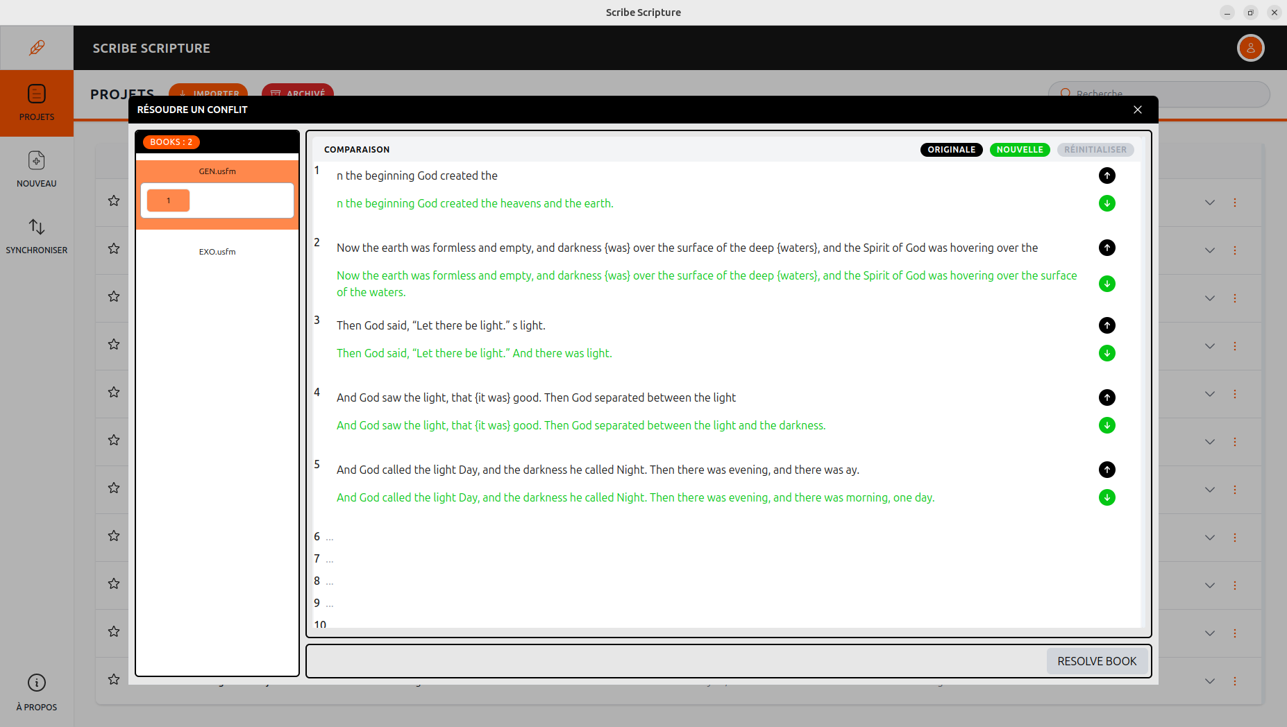 Une fois tous les conflits d'un chapitre résolus, le bouton Résoudre le livre apparaît.